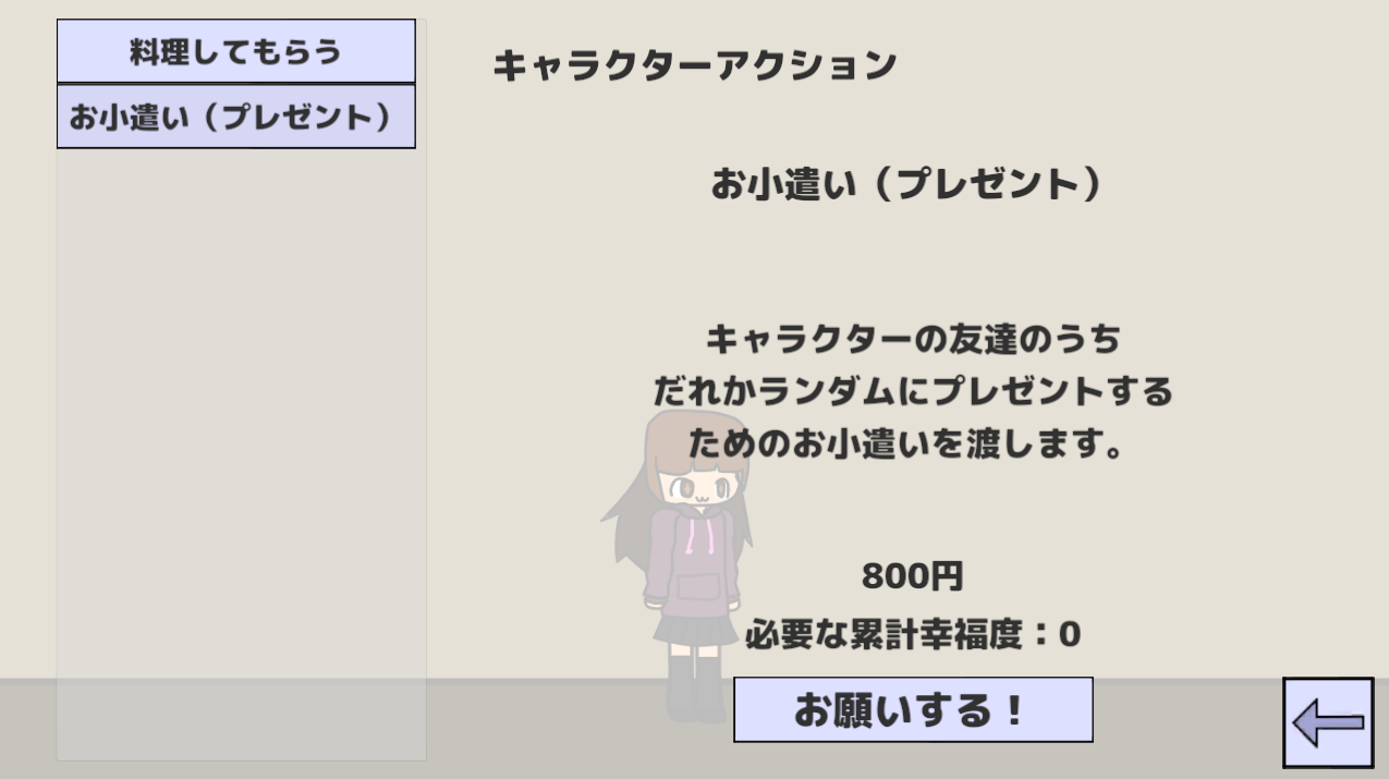 キャラクターアクション画面ではお金と累計幸福度を消費してキャラクターに何かをさせることができます。…賄賂とかそういうのじゃないですよ。料理だったら材料費だし、プレゼントを渡しに行くのはプレゼントを買うお金ってことですからね。